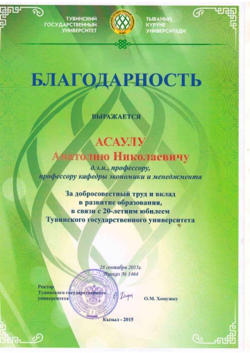 В 2015 г. Ректором Тувинского государственного университета объявлена благодарность за добросовестный труди вклад в развитие образования, в связи с 20-летним юбилеем ТувГУ.