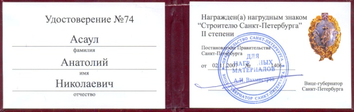 В 2007 г. награждён нагрудным знаком «Строителю Санкт-Петербурга» II степени.