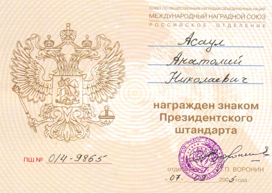 В 2005 г. награждён знаком президентского стандарта и часами.