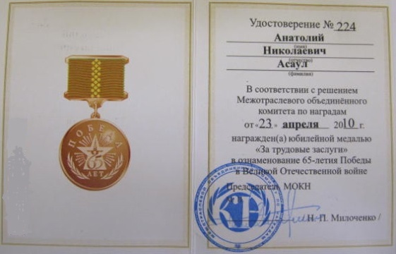 В 2010 г. награждён юбилейной медалью «За трудовые заслуги» в ознаменование 65-летия Победы в Великой отечественной войне.