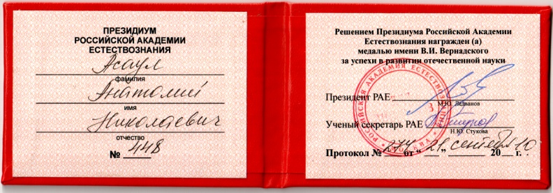 В 2014 г. Европейской академией естественных наук награждён памятной медалью имени В.И. Вернадского.