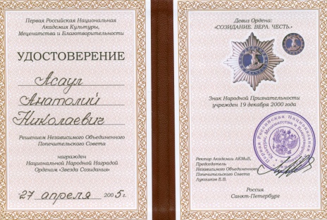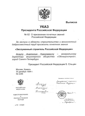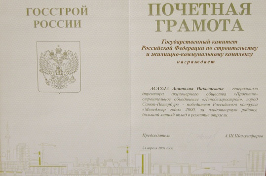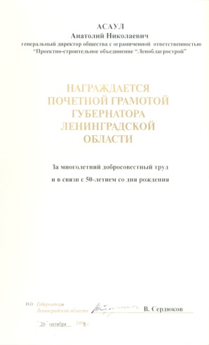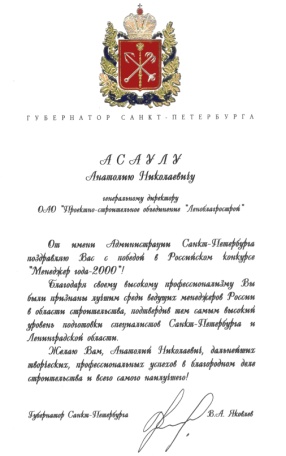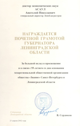 В 2000 г. Благодарственное письмо отгубернатора Санкт-Петербурга В.А. Яковлева.