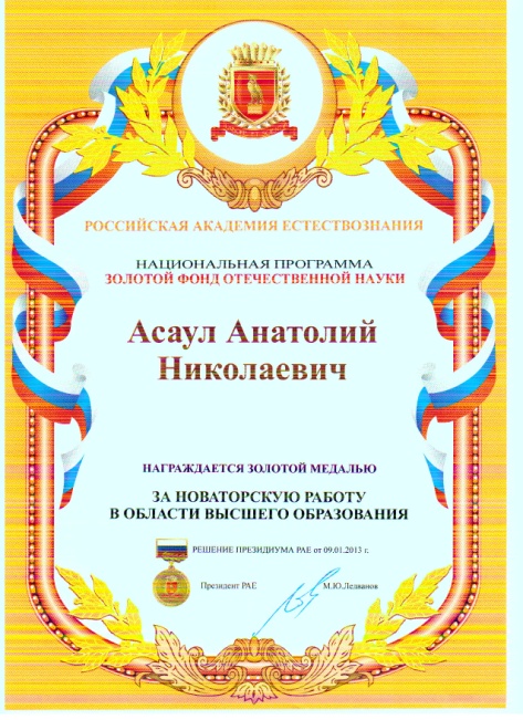 В 2013 г. Российской академией естествознания за достижения в развитии педагогики высшей школы награждён Золотой медалью «За новаторскую работу в области высшего образования».