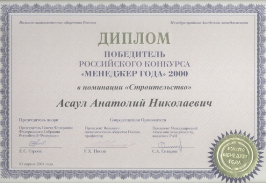 В 2001 г. победитель российского конкурса «Менеджер года-2000» в номинации «строительство».
