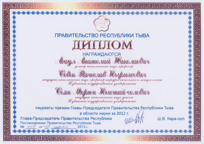В 2013 г. Лауреат премии главы – председателя правительства Республики Тыва в области науки за 2012 г.