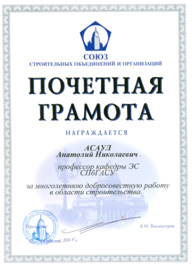 В 2005 г. награждён почётной грамотой Союзом строительных объединений и организаций за многолетнюю добросовестную работу в области строительства.
