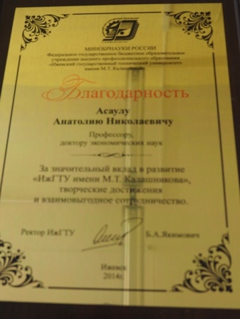 В 2014 г. Ректором ИжГТУБ.А. Якимовичем объявлена благодарность за значительный вклад в развитие «ИжГТУ имени М.Т. Калашникова», творческие достижения и взаимовыгодное сотрудничество.