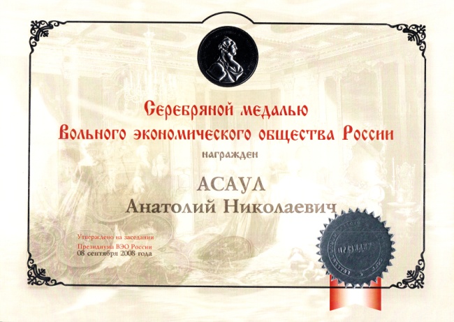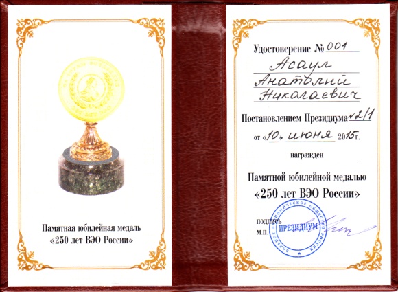 В 2015 г. награждён памятной юбилейной медалью «250 лет ВЭО России».