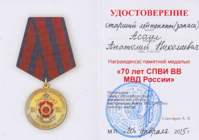 В 2015 г. награждён памятной медалью «70 лет СПВИ ВВ МВД России».