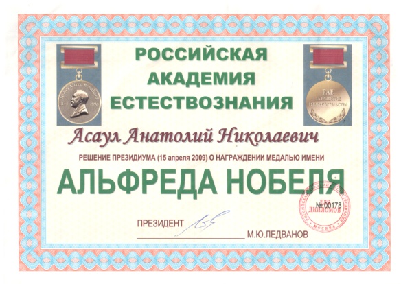 В 2009 г. Российской академией естествознания награждён медалью им. А. Нобеля за вклад в развитие изобретательства.