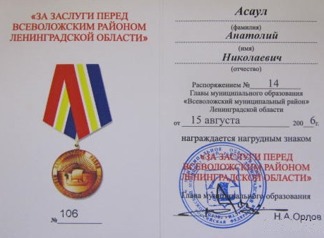 В 2006 г. награждён нагрудным знаком «За заслуги перед Всеволожским районом Ленинградской области».
