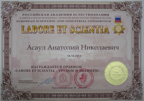 В 2013 г. Российской академией естествознания награждён орденом «Labore et scientia – трудом и знанием».