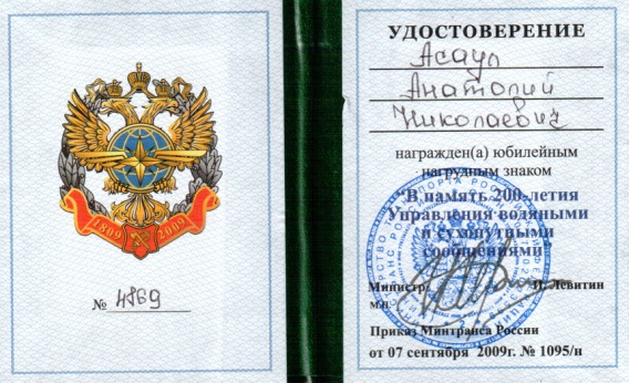 В 2009 г. награждён юбилейным нагрудным знаком «В память 200-летия Управления водяными и сухопутными сообщениями».