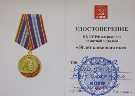 В 2011 г. награждён памятной медалью «50 лет космонавтики».