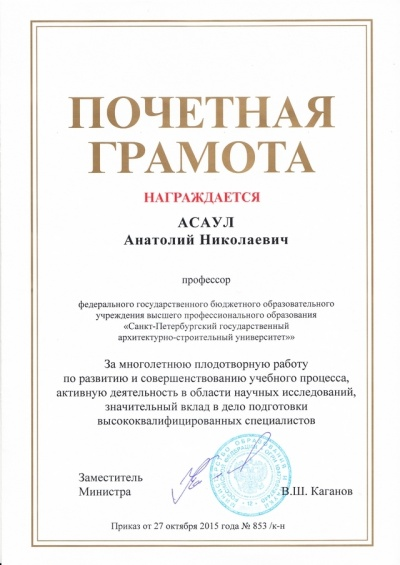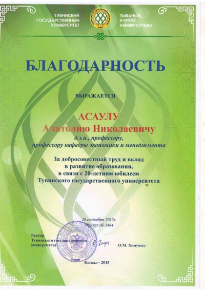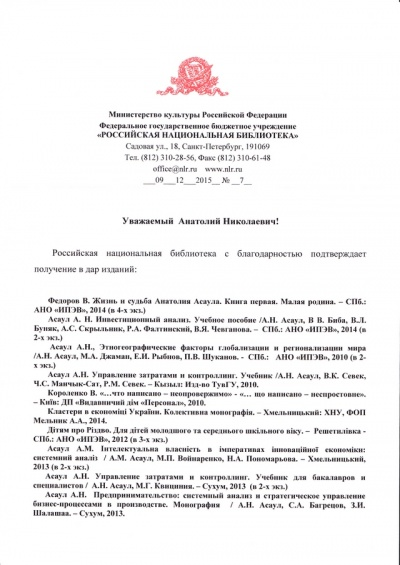 Благодарность от Российской национальной библиотеки профессору А.Н. Асаулу. 9 декабря 2015 г.