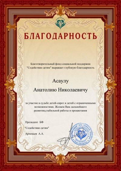 Благодарность за участие в благотворительности. (ноябрь 2015 г., г.Санкт Петербург)