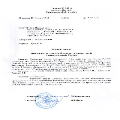 Избран почётным членом Союза экономистов Украины. 7 сентября 2011 г.