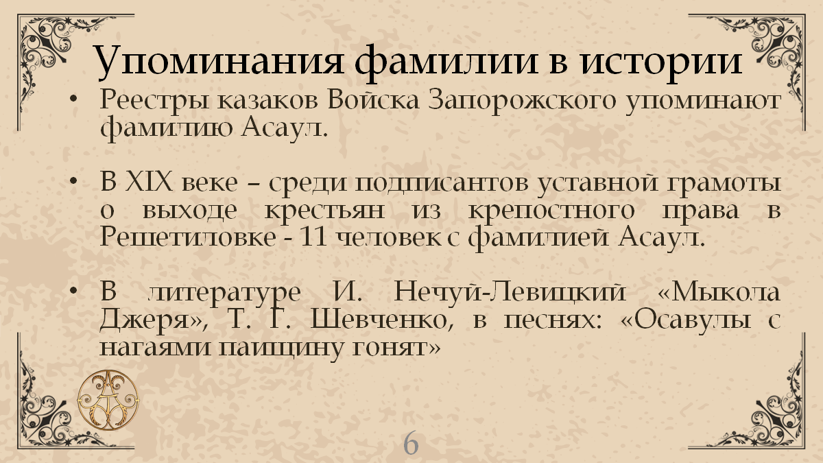 В конце XIVвека на территорию южных земель древнерусского государства (ныне территория Украины) из Польши пришла традиция создания фамилий как особых, наследуемых родовых именований. Так возникла фамилия Асаул, сохранившая неизменным «профессиональное» именование, ставшее для нее основой [31]. Впоследствии семейные именования образовывались путем прибавления к основному слову (имени, прозвищу отца) суффиксов притяжательных: у украинцев образование фамилий осуществлялось при помощи суффиксов - енко, - юк, -ец; у русских – -ов, -ин; у белорусов – - ович.