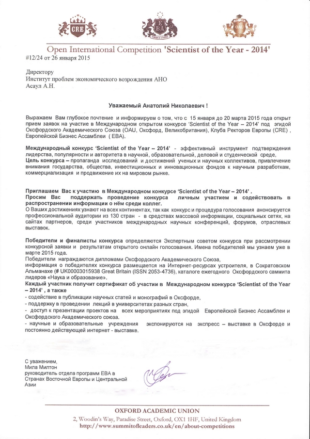 Профессор А.Н. Асаул признан Экспертным советом Международного конкурса «Scientist of the Year – 2014» победителем конкурса и награждён Дипломом высшего качества в категории «Гуманитарные науки» в области «Экономические науки». Международный конкурс «Scientist of the Year – 2014» проходил в г.Оксфорд (Великобритания) путём голосования.